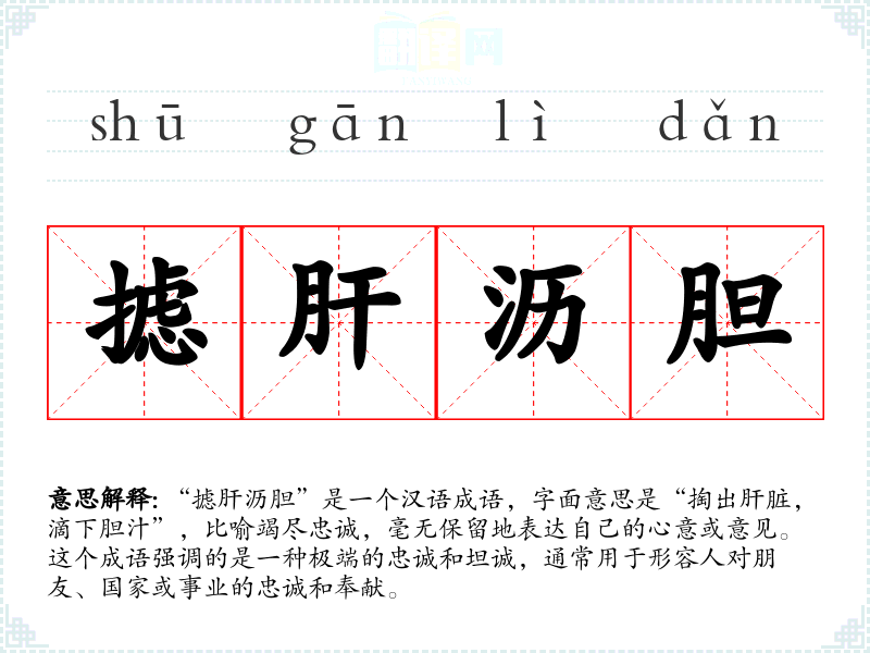 “摅肝沥胆”是一个汉语成语,字面意思是“掏出肝脏,滴下胆汁”,比喻竭尽忠诚,毫无保留地表达自己的心意或意见。这个成语强调的是一种极端的忠诚和坦诚,通常用于形容人对朋友、国家或事业的忠诚和奉献。