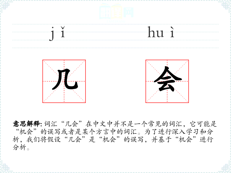 词汇“几会”在中文中并不是一个常见的词汇,它可能是“机会”的误写或者是某个方言中的词汇。为了进行深入学*和分析,我们将假设“几会”是“机会”的误写,并基于“机会”进行分析。