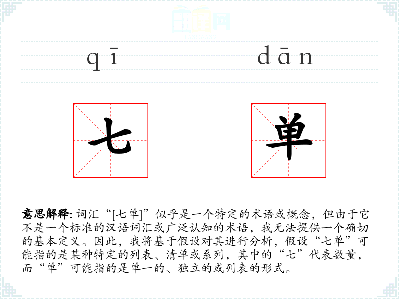 词汇“[七单]”似乎是一个特定的术语或概念,但由于它不是一个标准的汉语词汇或广泛认知的术语,我无法提供一个确切的基本定义。因此,我将基于假设对其进行分析,假设“七单”可能指的是某种特定的列表、清单或系列,其中的“七”代表数量,而“单”可能指的是单一的、独立的或列表的形式。