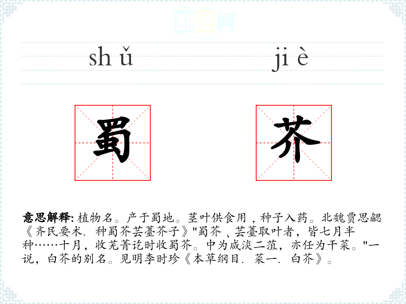 1.植物名。产于蜀地。茎叶供食用﹐种子入药。北魏贾思勰《齐民要术.种蜀芥芸薹芥子》"蜀芥﹑芸薹取叶者,皆七月半种……十月,收芜菁讫时收蜀芥。中为咸淡二菹,亦任为干菜。"一说,白芥的别名。见明李时珍《本草纲目.菜一.白芥》。
