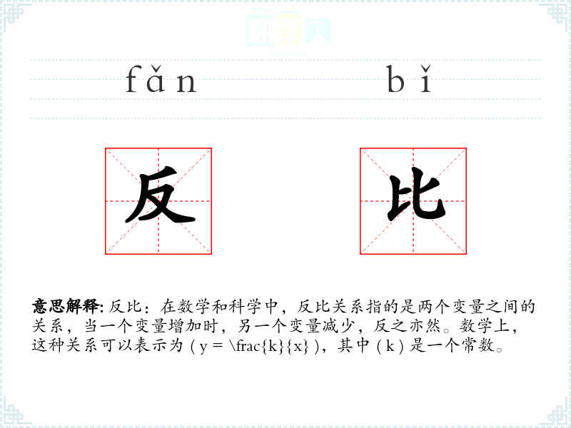 反比:在数学和科学中,反比关系指的是两个变量之间的关系,当一个变量增加时,另一个变量减少,反之亦然。数学上,这种关系可以表示为 ( y = \frac{k}{x} ),其中 ( k ) 是一个常数。