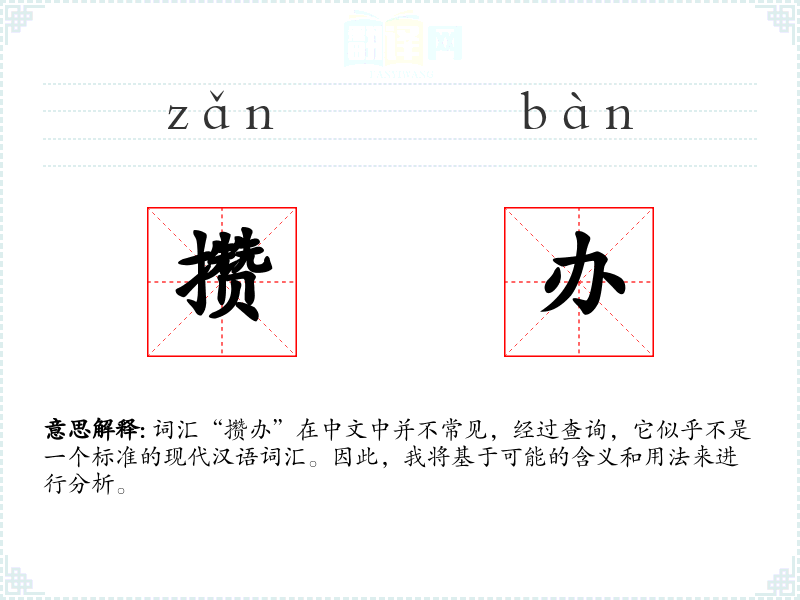 词汇“攒办”在中文中并不常见,经过查询,它似乎不是一个标准的现代汉语词汇。因此,我将基于可能的含义和用法来进行分析。