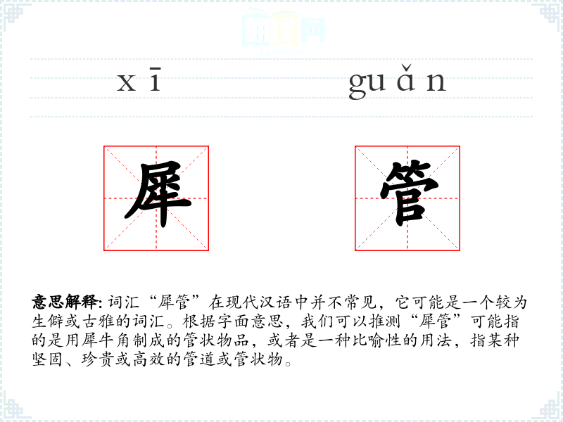 词汇“犀管”在现代汉语中并不常见,它可能是一个较为生僻或古雅的词汇。根据字面意思,我们可以推测“犀管”可能指的是用犀牛角制成的管状物品,或者是一种比喻性的用法,指某种坚固、珍贵或高效的管道或管状物。
