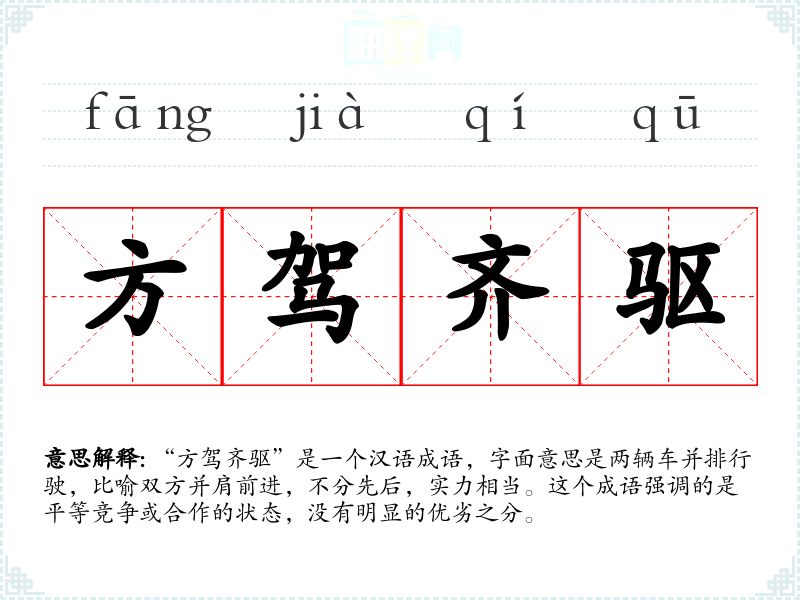 “方驾齐驱”是一个汉语成语,字面意思是两辆车并排行驶,比喻双方并肩前进,不分先后,实力相当。这个成语强调的是平等竞争或合作的状态,没有明显的优劣之分。