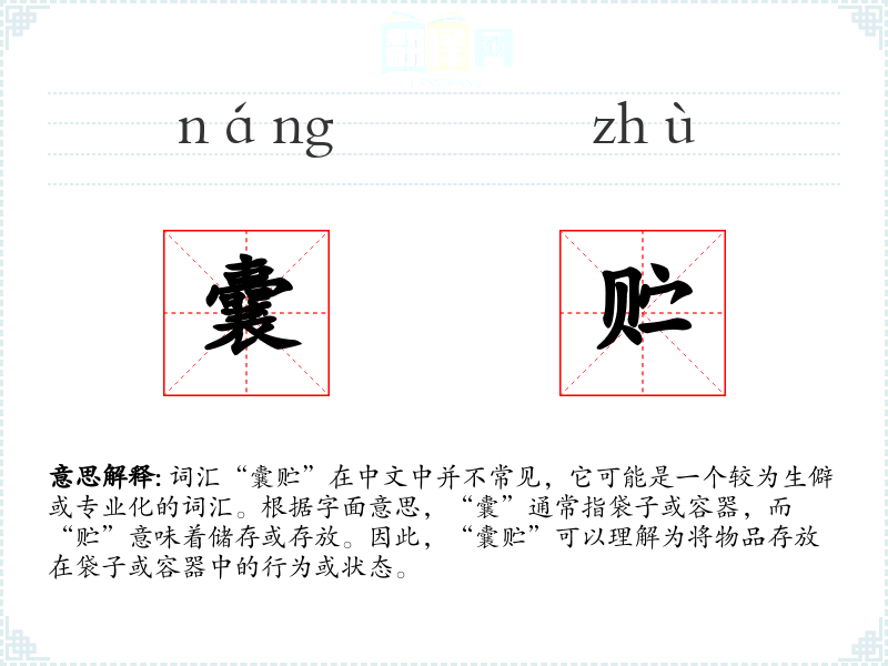 词汇“囊贮”在中文中并不常见,它可能是一个较为生僻或专业化的词汇。根据字面意思,“囊”通常指袋子或容器,而“贮”意味着储存或存放。因此,“囊贮”可以理解为将物品存放在袋子或容器中的行为或状态。