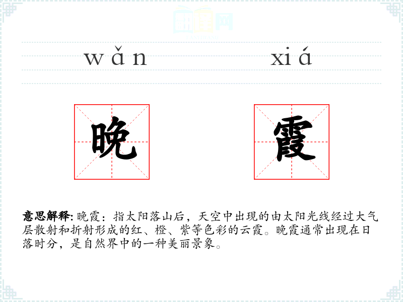 晚霞:指太阳落山后,天空中出现的由太阳光线经过大气层散射和折射形成的红、橙、紫等色彩的云霞。晚霞通常出现在日落时分,是自然界中的一种美丽景象。