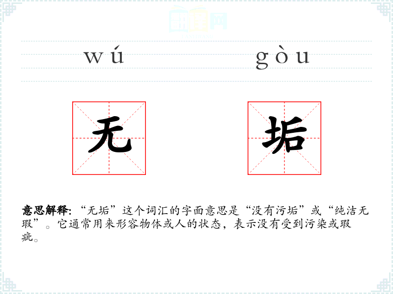 “无垢”这个词汇的字面意思是“没有污垢”或“纯洁无瑕”。它通常用来形容物体或人的状态,表示没有受到污染或瑕疵。