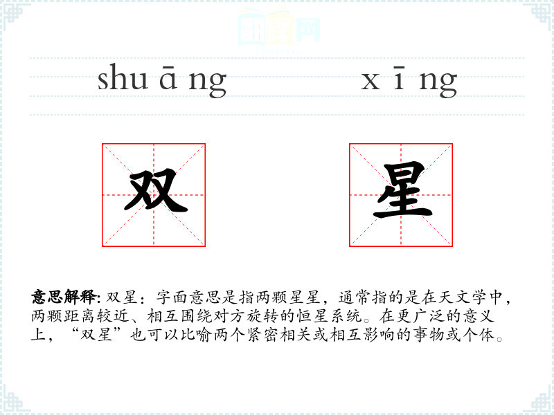 双星:字面意思是指两颗星星,通常指的是在天文学中,两颗距离较近、相互围绕对方旋转的恒星系统。在更广泛的意义上,“双星”也可以比喻两个紧密相关或相互影响的事物或个体。