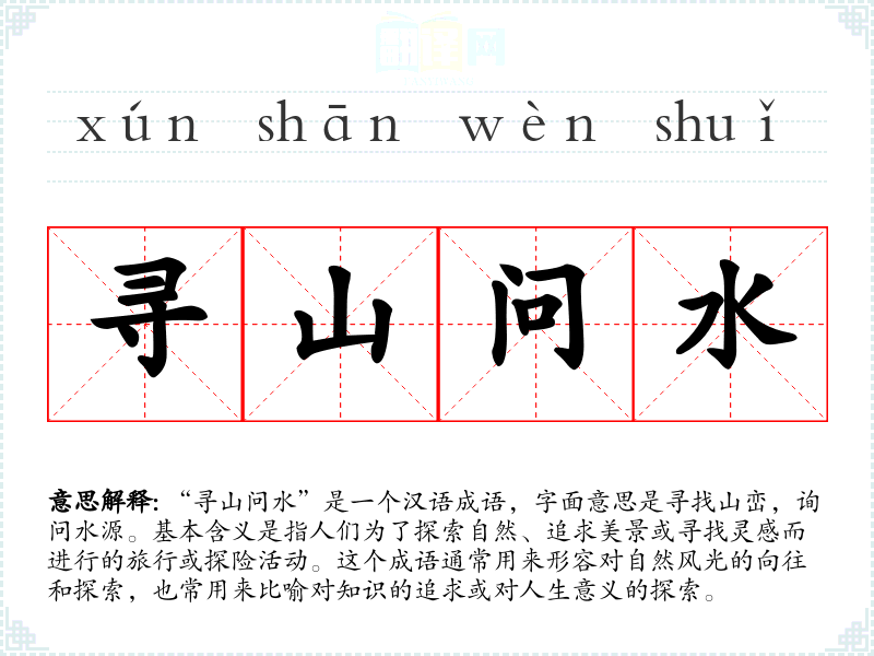 “寻山问水”这个成语的词源较为模糊,但它体现了古代文人对自然的热爱和追求。随着时间的推移,这个成语的含义逐渐扩展,不仅仅局限于对自然风光的探索,也包括了对知识和人生意义的追求。