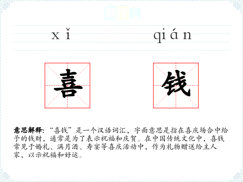 “喜钱”是一个汉语词汇,字面意思是指在喜庆场合中给予的钱财,通常是为了表示祝福和庆贺。在**传统文化中,喜钱常见于婚礼、满月酒、寿宴等喜庆活动中,作为礼物赠送给主人家,以示祝福和好运。