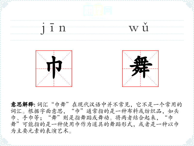 由于“巾舞”不是一个常见的词汇,它在不同的语境中可能会有不同的解释。在文学作品中,它可能被用来形容一种优雅或神秘的舞蹈;在口语中,它可能被用来比喻某种轻盈或飘逸的动作。