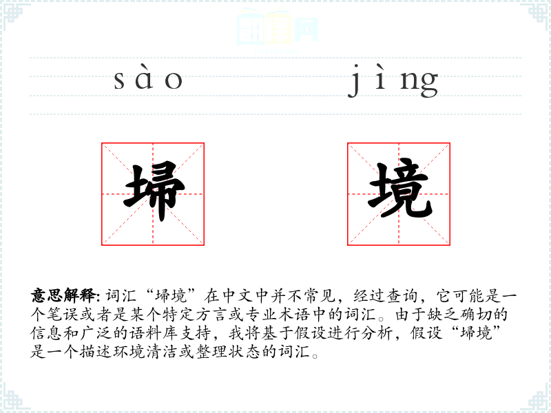 词汇“埽境”在中文中并不常见,经过查询,它可能是一个笔误或者是某个特定方言或专业术语中的词汇。由于缺乏确切的信息和广泛的语料库支持,我将基于假设进行分析,假设“埽境”是一个描述环境清洁或整理状态的词汇。