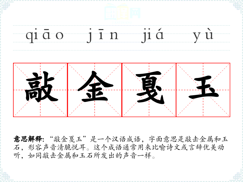 在传统文化中,金属和玉石都具有特殊的象征意义。金属象征坚固和永恒,玉石象征纯洁和高贵。因此,“敲金戛玉”这个成语也蕴含了对传统文化中美好品质的赞美。