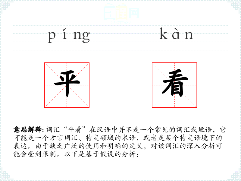 词汇“平看”在汉语中并不是一个常见的词汇或短语,它可能是一个方言词汇、特定领域的术语,或者是某个特定语境下的表达。由于缺乏广泛的使用和明确的定义,对该词汇的深入分析可能会受到限制。以下是基于假设的分析: