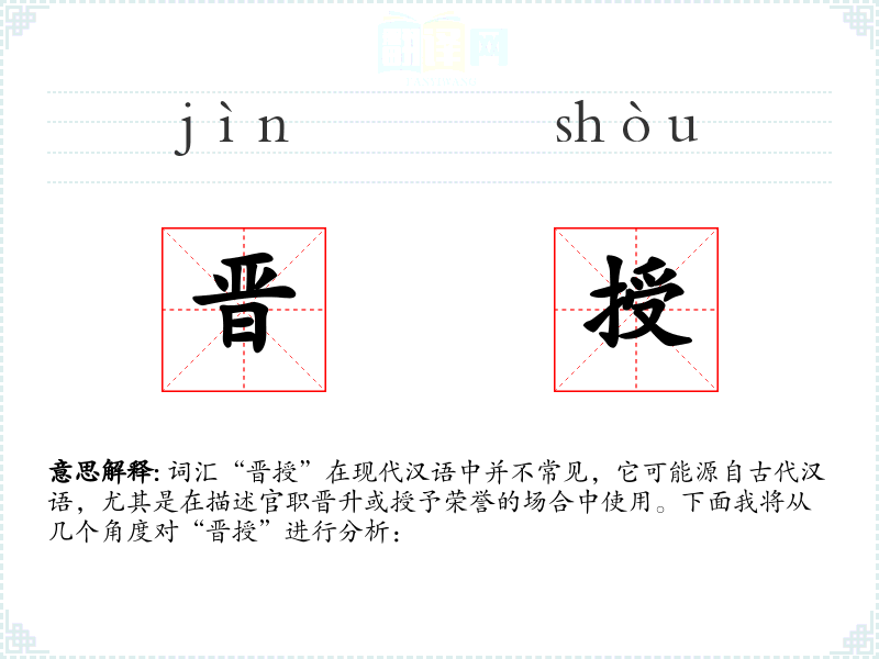 “晋授”字面意思是指晋升并授予某种职位或荣誉。其中,“晋”意味着提升、晋升,“授”则是授予、给予的意思。