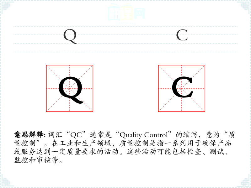 词汇“QC”通常是“Quality Control”的缩写,意为“质量控制”。在工业和生产领域,质量控制是指一系列用于确保产品或服务达到一定质量要求的活动。这些活动可能包括检查、测试、监控和审核等。