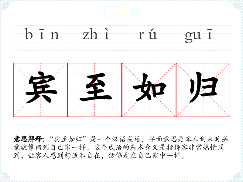 “宾至如归”是一个汉语成语,字面意思是客人到来时感觉就像回到自己家一样。这个成语的基本含义是指待客非常热情周到,让客人感到舒适和自在,仿佛是在自己家中一样。