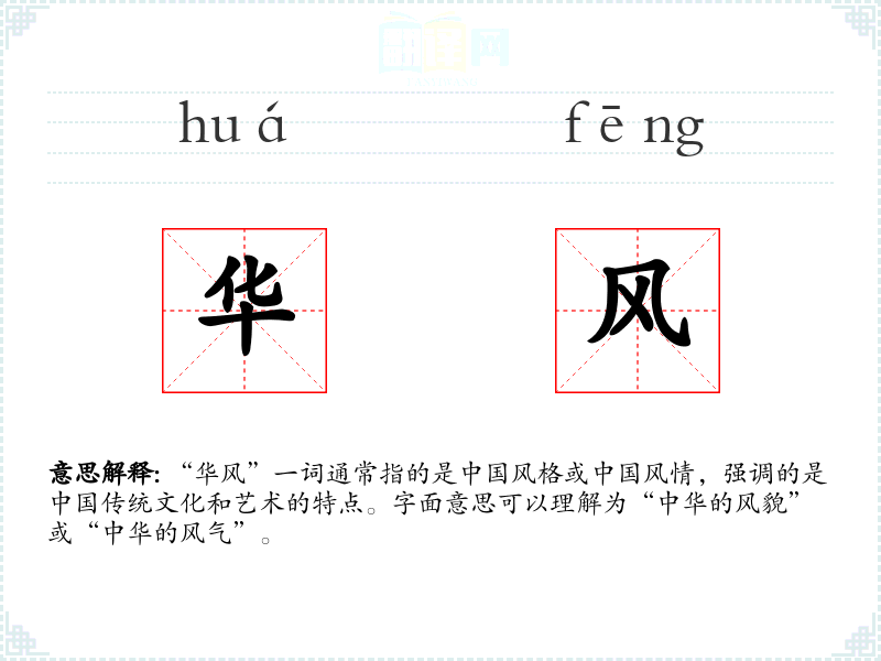 “华风”一词通常指的是风格或风情,强调的是**传统文化和艺术的特点。字面意思可以理解为“中华的风貌”或“中华的风气”。