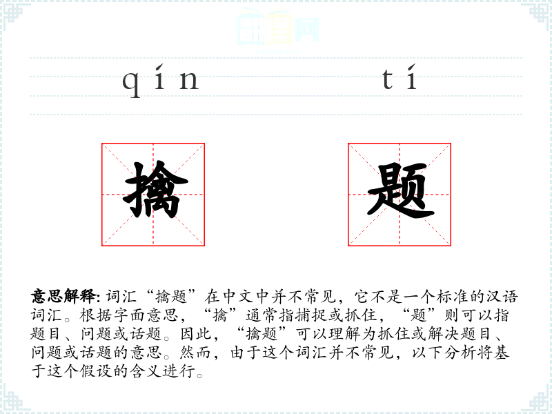 “擒题”虽然不是一个常用词汇,但它体现了在特定语境下对问题解决能力的强调。在学习和表达中,了解和掌握这样的词汇可以丰富语言的表达能力。