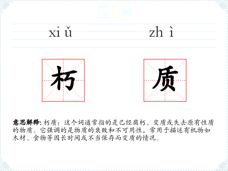 - 专业领域:在生物学或食品科学中,“朽质”可能特指有机物因微生物作用而发生的化学变化。