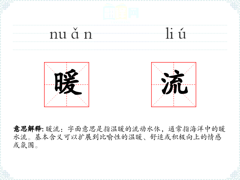 暖流:字面意思是指温暖的流动水体,通常指海洋中的暖水流。基本含义可以扩展到比喻性的温暖、舒适或积极向上的情感或氛围。