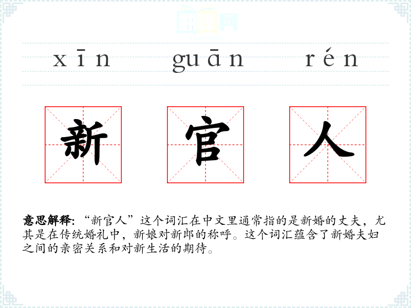 “新官人”这个词汇在中文里通常指的是新婚的丈夫,尤其是在传统婚礼中,新娘对新郎的称呼。这个词汇蕴含了新婚夫妇之间的亲密关系和对新生活的期待。