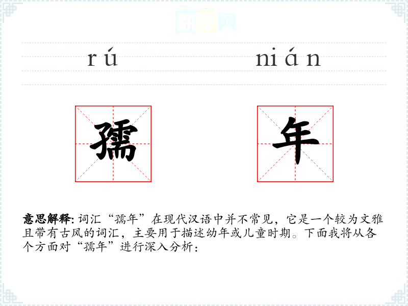 词汇“孺年”在现代汉语中并不常见,它是一个较为文雅且带有古风的词汇,主要用于描述幼年或儿童时期。下面我将从各个方面对“孺年”进行深入分析: