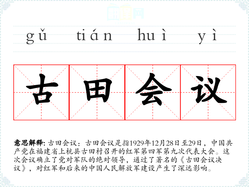 在其他语言和文化中,可能没有直接对应“古田会议”的词汇,但可以通过解释这次会议的重要性和影响,让其他文化背景的人理解其意义。