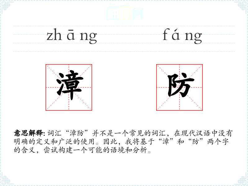 词汇“漳防”并不是一个常见的词汇,在现代汉语中没有明确的定义和广泛的使用。因此,我将基于“漳”和“防”两个字的含义,尝试构建一个可能的语境和分析。