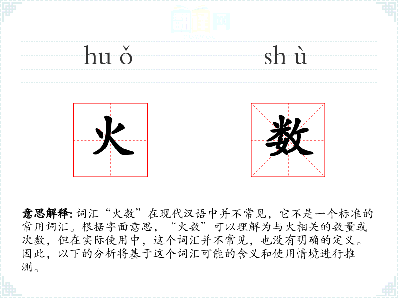 “火数”的词源不明确,因为它不是一个常用词汇,可能是在特定语境下由“火”和“数”两个字组合而成的临时表达。