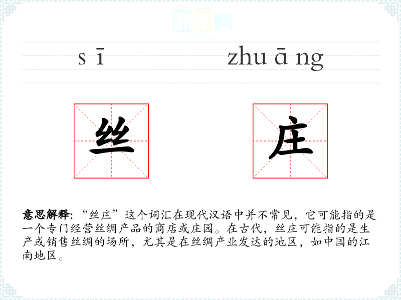 “丝庄”这个词汇在现代汉语中并不常见,它可能指的是一个专门经营丝绸产品的商店或庄园。在古代,丝庄可能指的是生产或销售丝绸的场所,尤其是在丝绸产业发达的地区,如**的江南地区。