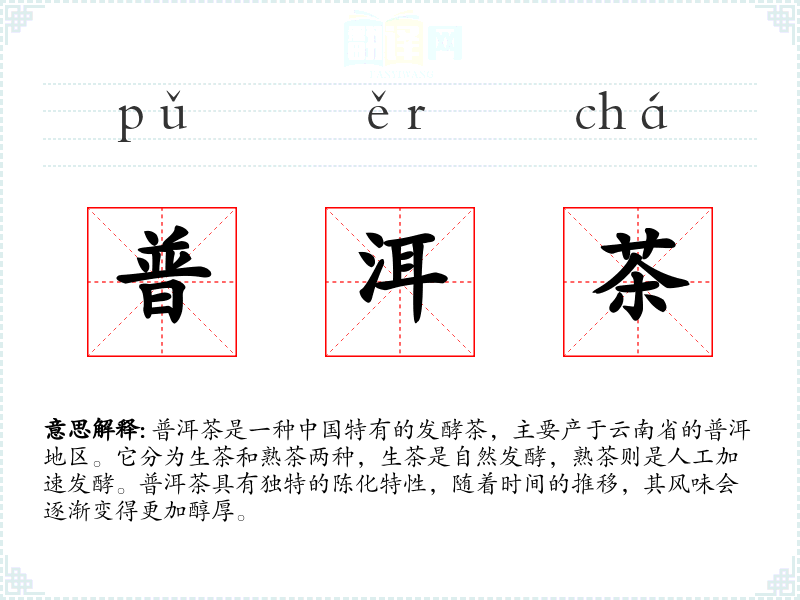 同义词:云南茶、陈年茶 反义词:绿茶、新鲜茶