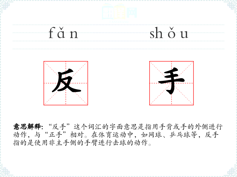 “反手”这个词汇的字面意思是指用手背或手的外侧进行动作,与“正手”相对。在体育**中,如网球、乒乓球等,反手指的是使用非主手侧的手臂进行击球的动作。