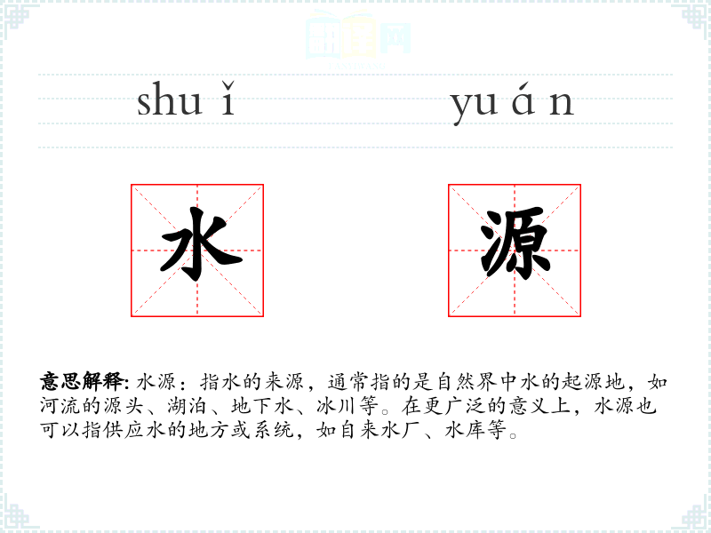 水源:指水的来源,通常指的是自然界中水的起源地,如河流的源头、湖泊、地下水、冰川等。在更广泛的意义上,水源也可以指供应水的地方或系统,如自来水厂、水库等。