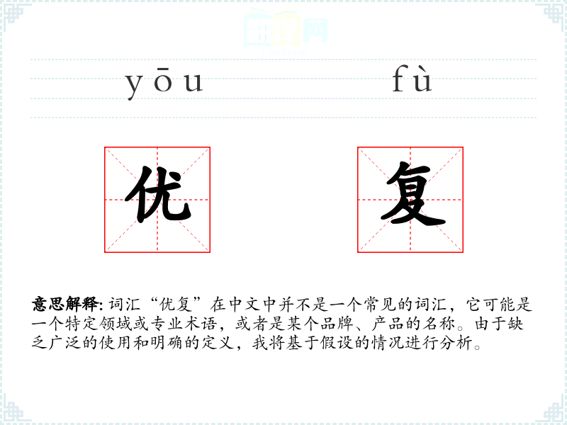 词汇“优复”在中文中并不是一个常见的词汇,它可能是一个特定领域或专业术语,或者是某个品牌、产品的名称。由于缺乏广泛的使用和明确的定义,我将基于假设的情况进行分析。