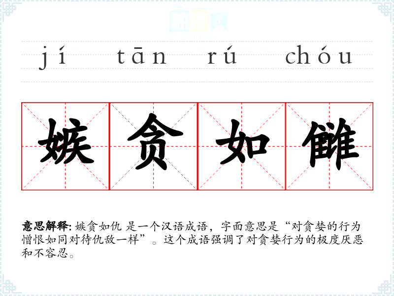 嫉贪如仇 是一个汉语成语,字面意思是“对贪婪的行为憎恨如同对待仇敌一样”。这个成语强调了对贪婪行为的极度厌恶和不容忍。