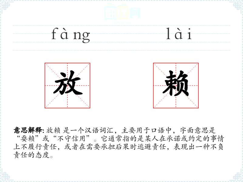 放赖 是一个汉语词汇,主要用于口语中,字面意思是“耍赖”或“不守信用”。它通常指的是某人在承诺或约定的事情上不履行责任,或者在需要承担后果时逃避责任,表现出一种不负责任的态度。