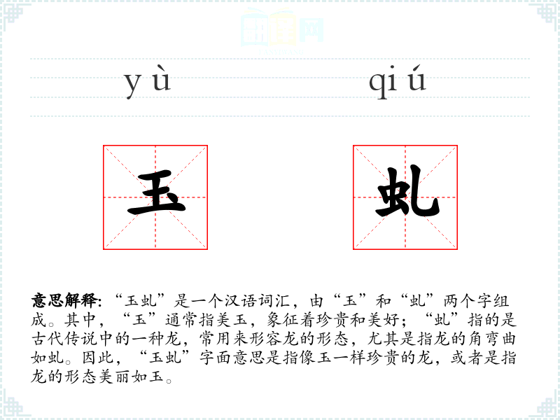 在**文化中,龙是吉祥和权力的象征,而“玉”则代表着珍贵和美好。因此,“玉虬”这个词汇融合了这两种象征意义,常被用来形容高贵和神秘的事物。