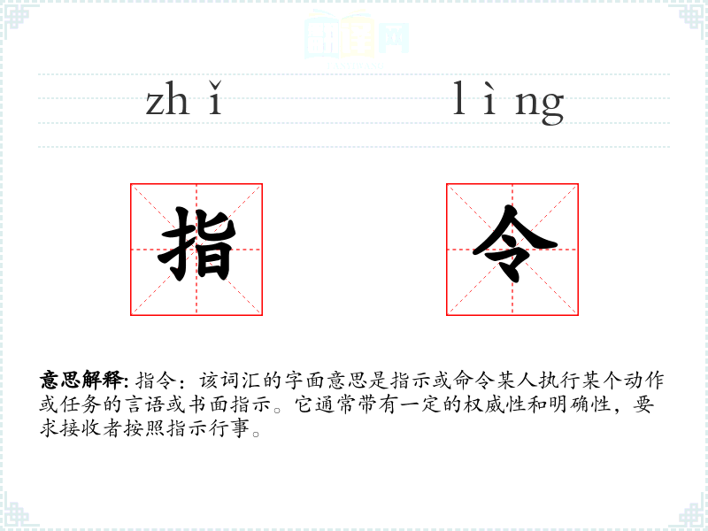 指令:该词汇的字面意思是指示或命令某人执行某个动作或任务的言语或书面指示。它通常带有一定的权威性和明确性,要求接收者按照指示行事。