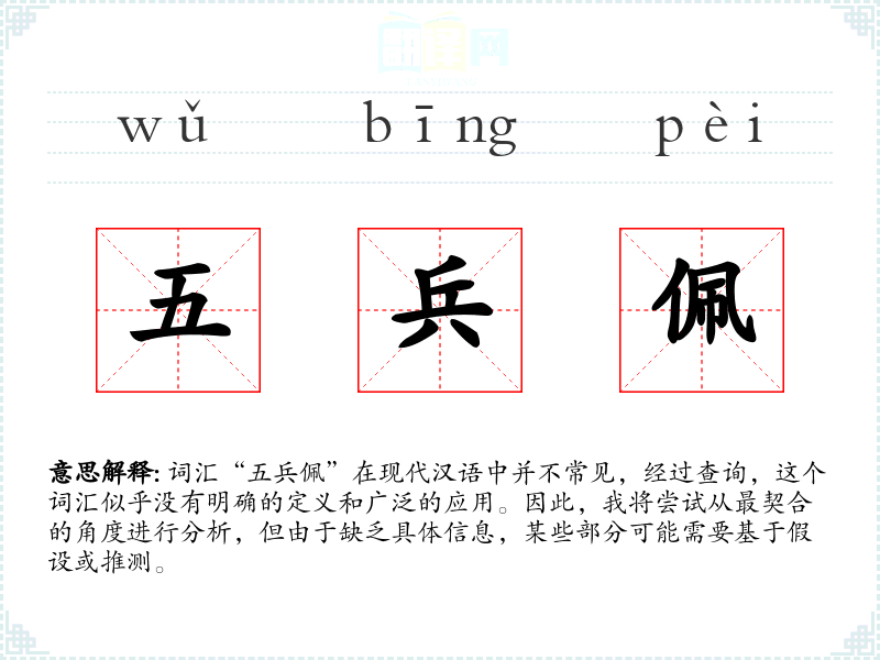 词汇“五兵佩”在现代汉语中并不常见,经过查询,这个词汇似乎没有明确的定义和广泛的应用。因此,我将尝试从最契合的角度进行分析,但由于缺乏具体信息,某些部分可能需要基于假设或推测。
