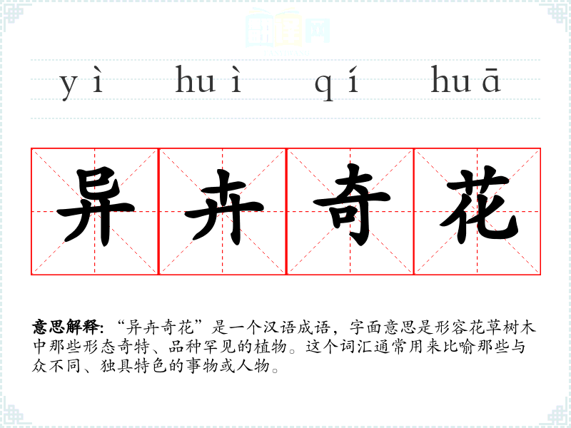 “异卉奇花”是一个汉语成语,字面意思是形容花草树木中那些形态奇特、品种罕见的植物。这个词汇通常用来比喻那些与众不同、独具特色的事物或人物。