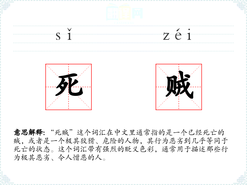 “死贼”这个词汇在中文里通常指的是一个已经死亡的贼,或者是一个极其狡猾、危险的人物,其行为恶劣到几乎等同于死亡的状态。这个词汇带有强烈的贬义色彩,通常用于描述那些行为极其恶劣、令人憎恶的人。