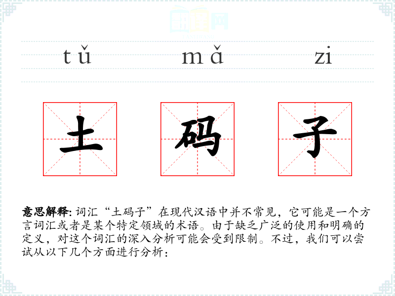 词汇“土码子”在现代汉语中并不常见,它可能是一个方言词汇或者是某个特定领域的术语。由于缺乏广泛的使用和明确的定义,对这个词汇的深入分析可能会受到限制。不过,我们可以尝试从以下几个方面进行分析: