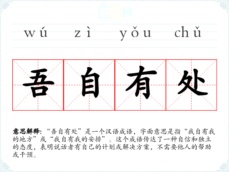 “吾自有处”是一个汉语成语,字面意思是指“我自有我的地方”或“我自有我的安排”。这个成语传达了一种自信和独立的态度,表明说话者有自己的计划或解决方案,不需要他人的帮助或干预。