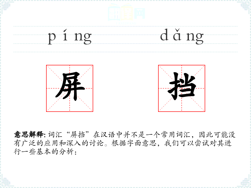 词汇“屏挡”在汉语中并不是一个常用词汇,因此可能没有广泛的应用和深入的讨论。根据字面意思,我们可以尝试对其进行一些基本的分析: