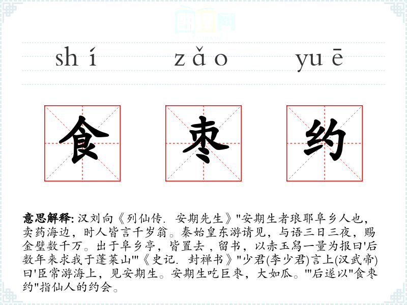 汉刘向《列仙传.安期先生》"安期生者琅耶阜乡人也,卖药海边,时人皆言千岁翁。秦始皇东游请见,与语三日三夜,赐金璧数千万。出于阜乡亭,皆置去﹐留书,以赤玉舄一量为报曰'后数年来求我于蓬莱山'"《史记.封禅书》"少君(李少君)言上(汉武帝)曰'臣常游海上,见安期生。安期生吃巨枣,大如瓜。'"后遂以"食枣约"指仙人的约会。