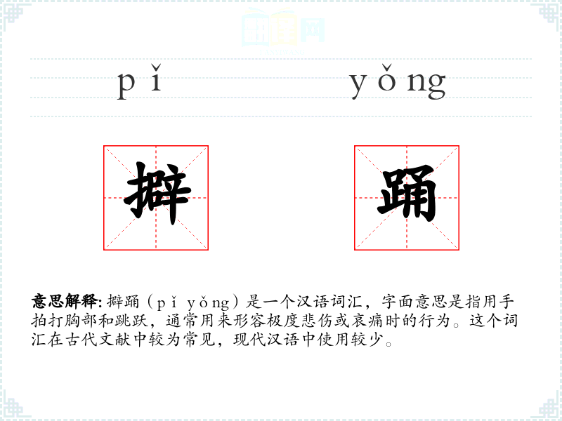擗踊(pǐ yǒng)是一个汉语词汇,字面意思是指用手拍打胸部和跳跃,通常用来形容极度悲伤或哀痛时的行为。这个词汇在古代文献中较为常见,现代汉语中使用较少。