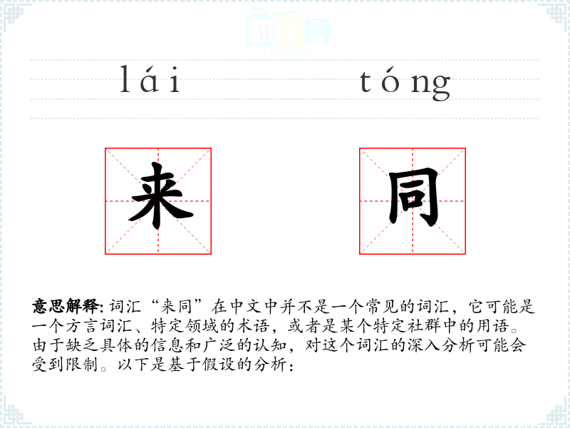 词汇“来同”在中文中并不是一个常见的词汇,它可能是一个方言词汇、特定领域的术语,或者是某个特定社群中的用语。由于缺乏具体的信息和广泛的认知,对这个词汇的深入分析可能会受到限制。以下是基于假设的分析: