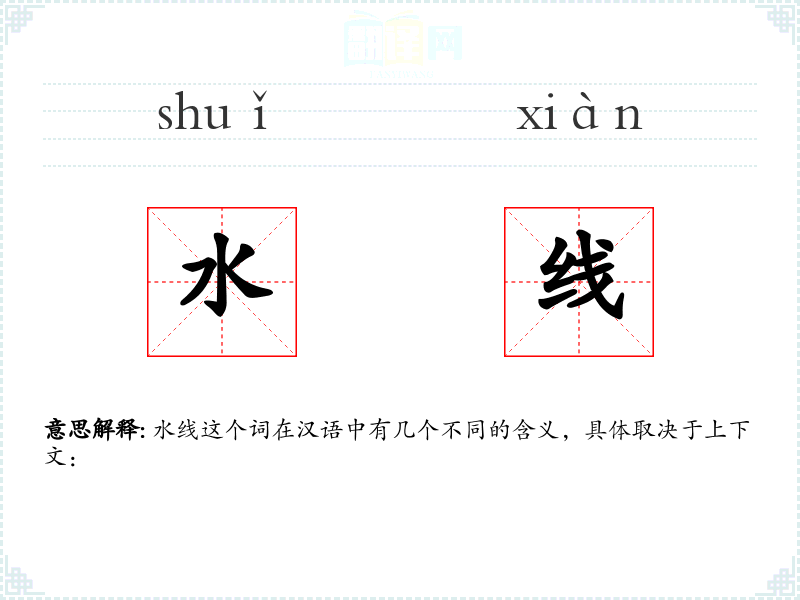 - 字面意思:指水面与物体接触的线,如船只的水线,即船体在水面上的分界线。