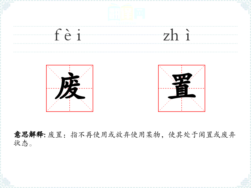 “废置”一词由“废”和“置”两个字组成。“废”字古已有之,意为废弃、不再使用;“置”字意为放置、安置。两者结合,形成了“废置”这一词汇,表示将某物放置在不再使用的状态。